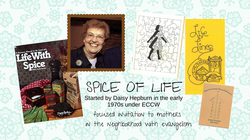 The first record of Spice of Life meetings is from the early 1970s. Daisy Hepburn, founder of Spice, saw a need to evangelize to the community. Being a child of Salvation Army missionaries, she was accustomed to grassroots efforts. Evangelism was in her blood. A neighbor came to visit Daisy and shared some of the seasoned salt that she had created. Daisy was struck by the wonderful idea of sharing spice with one another and a plan for Spice began to form. The vision was to create a morning gathering with specific focus on outreach to the mothers in the neighborhood.
