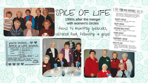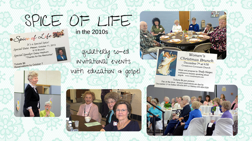 After a number of years Daisy was called to serve in a new location and moved away but her impact was so powerful and the ministry so meaningful that it couldn't end.The leadership reins for Spice had passed to Sharon Peterson and then to Bev Lohmann. Women’s ministry began to evolve and by 1987 at the merger of Elim Covenant Church and Park Avenue Covenant, ministry was no longer divided into service groups, but divided by functions and called “Circles.” Bev recalls the moment she knew God was calling her to lead Spice. Bev states she made a “bargain with God.” She would take over Spice if Ruth Holm would agree to catering the food. Bev mustered up her courage and approached Ruth in the parking lot to ask the big question. “I asked if she would cook for Spice and I would manage. She didn’t even let me finish the question because she was so intent on making Spice go.” Bev explains that she had two goals in taking over the ministry. She wanted to keep the spirit of Daisy’s mission alive and keep the cost low so that everyone was able to attend. The priority was Biblical programming and fellowship.